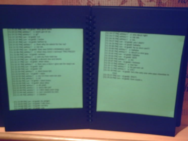 lavi's present! she print out our FIRST CONVO ON MSN!! like omg pls. and and she print out pics of my pgs (: pics of how we got t know each other. damn sweet i swear. bet she spend like one million years t compile everyhing in the book. i really love it, ALOT. THANKS LAVI! I LOVE YOU SO MUCH.